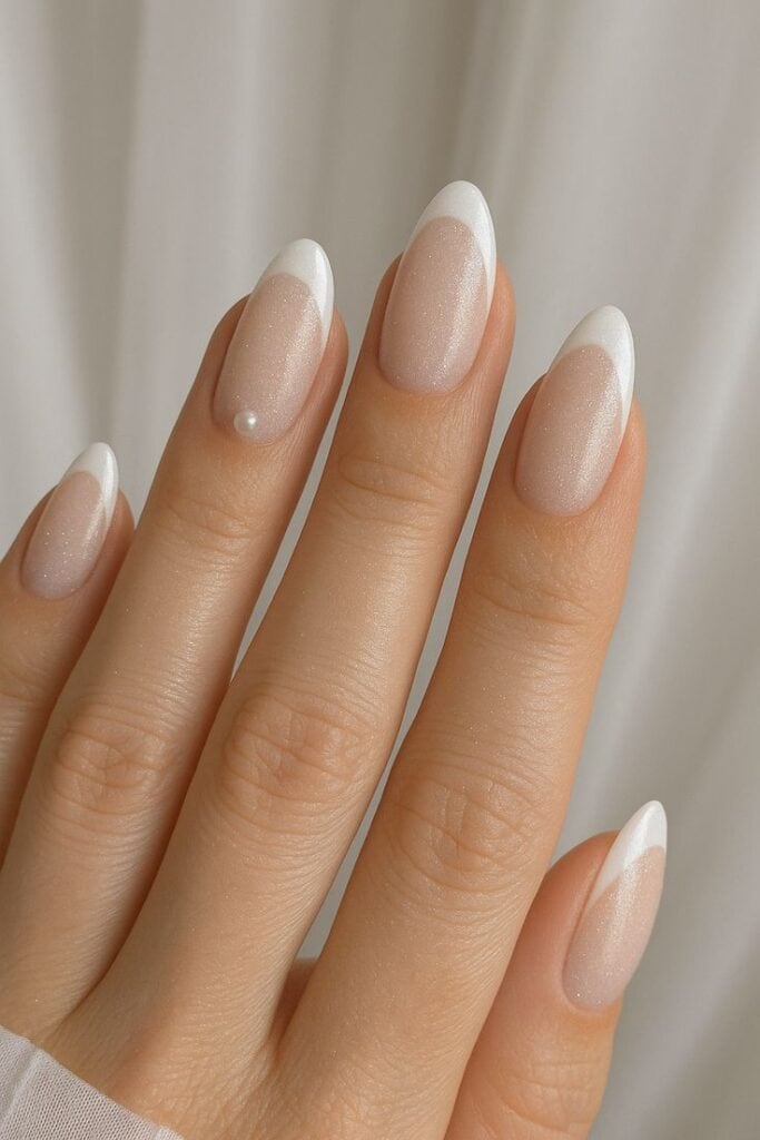 Ein echter Klassiker für Bräute: dezente French Nails. Der Look ist clean, elegant und passt einfach zu jedem Kleid und jeder Stilrichtung. Die helle Spitze verlängert optisch den Nagel und sorgt für ein zeitloses Ergebnis.